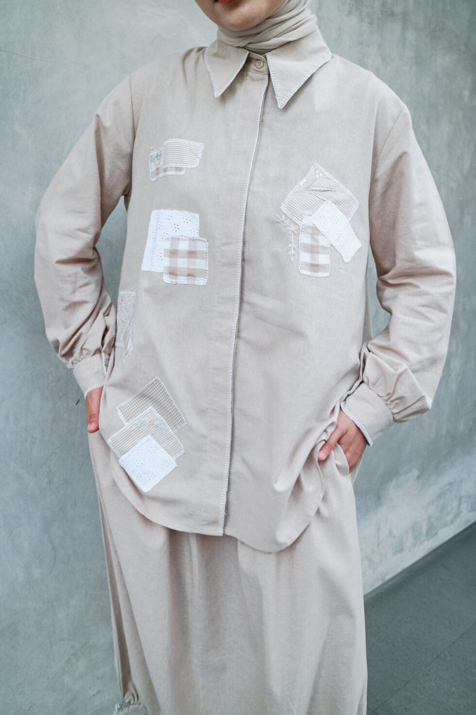 Kemeja ini dilengkapi detail patchwork dari kain sisa,